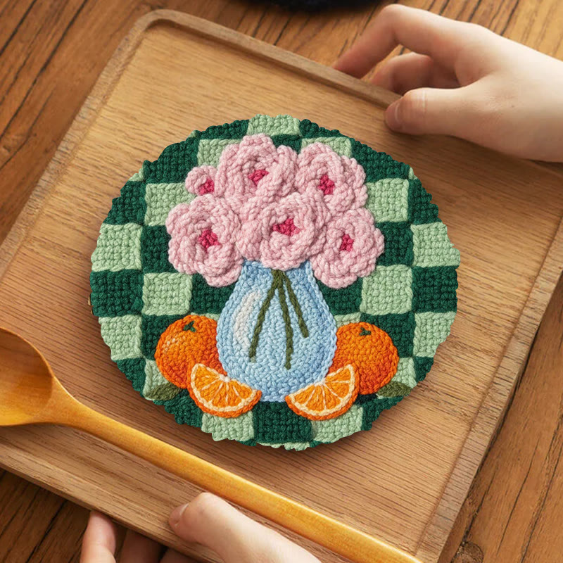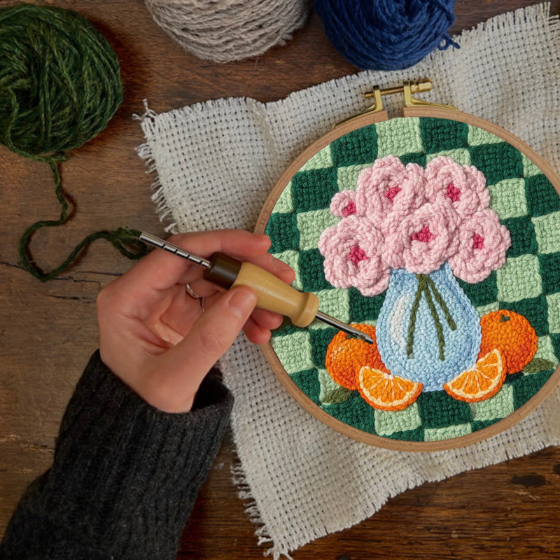 Blush Flower And Orange Checkerboard Punch Needle Kit – Exquisite Handmade Gift | Novice-Friendly DIY Project