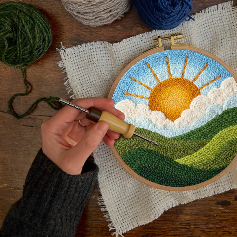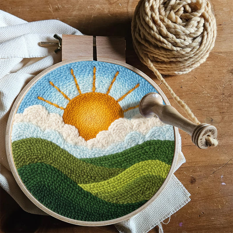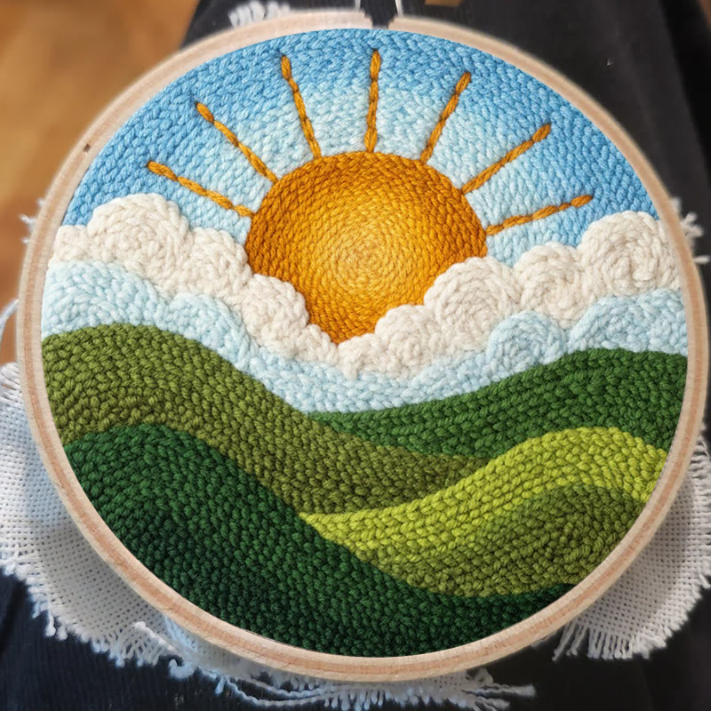 Bright Sunrise Cloudscape Green Hills Punch Needle Kit – Handcrafted Decor Hanger | Novice Friendly Diy Project