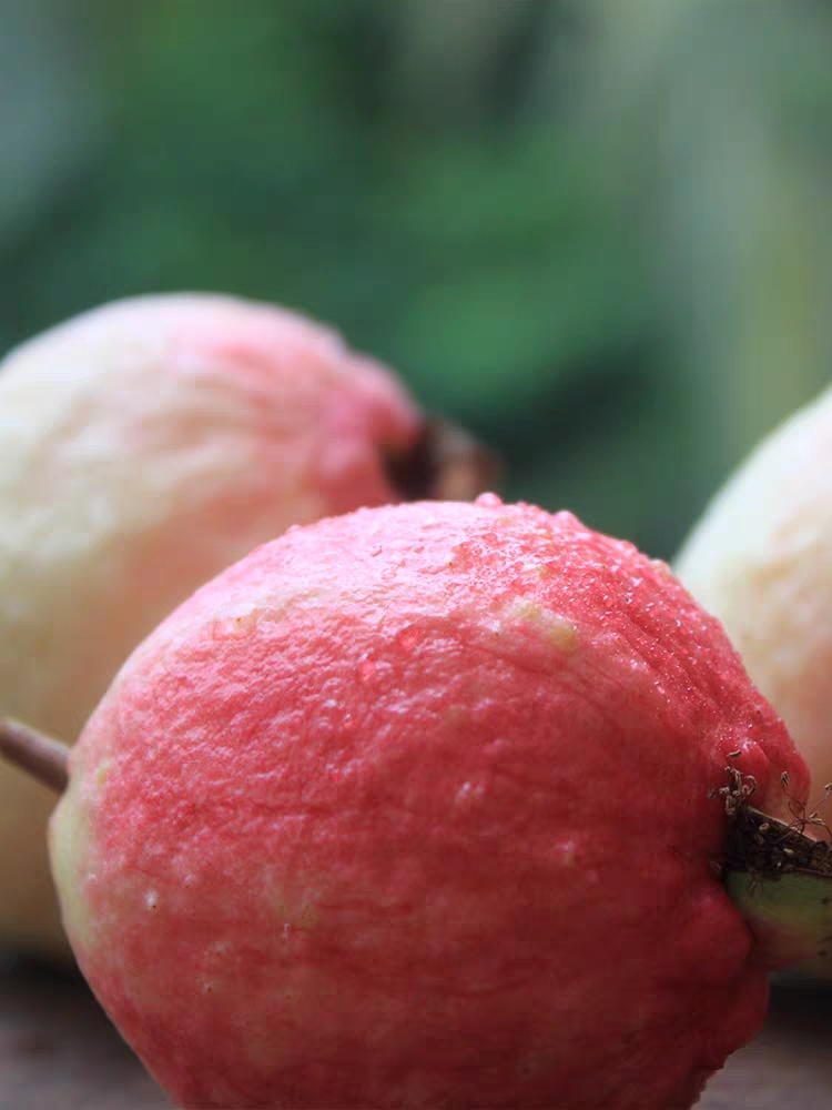 The regular guava is emerald green and large in size. while the carmine guava is very special. When mature. the appearance looks like a thin layer of rouge. shiny and eye-catching. small in size. the fruit is gourd-shaped. the orchard is thick. and the center of the fruit is multi-seeded. sweet and juicy.
