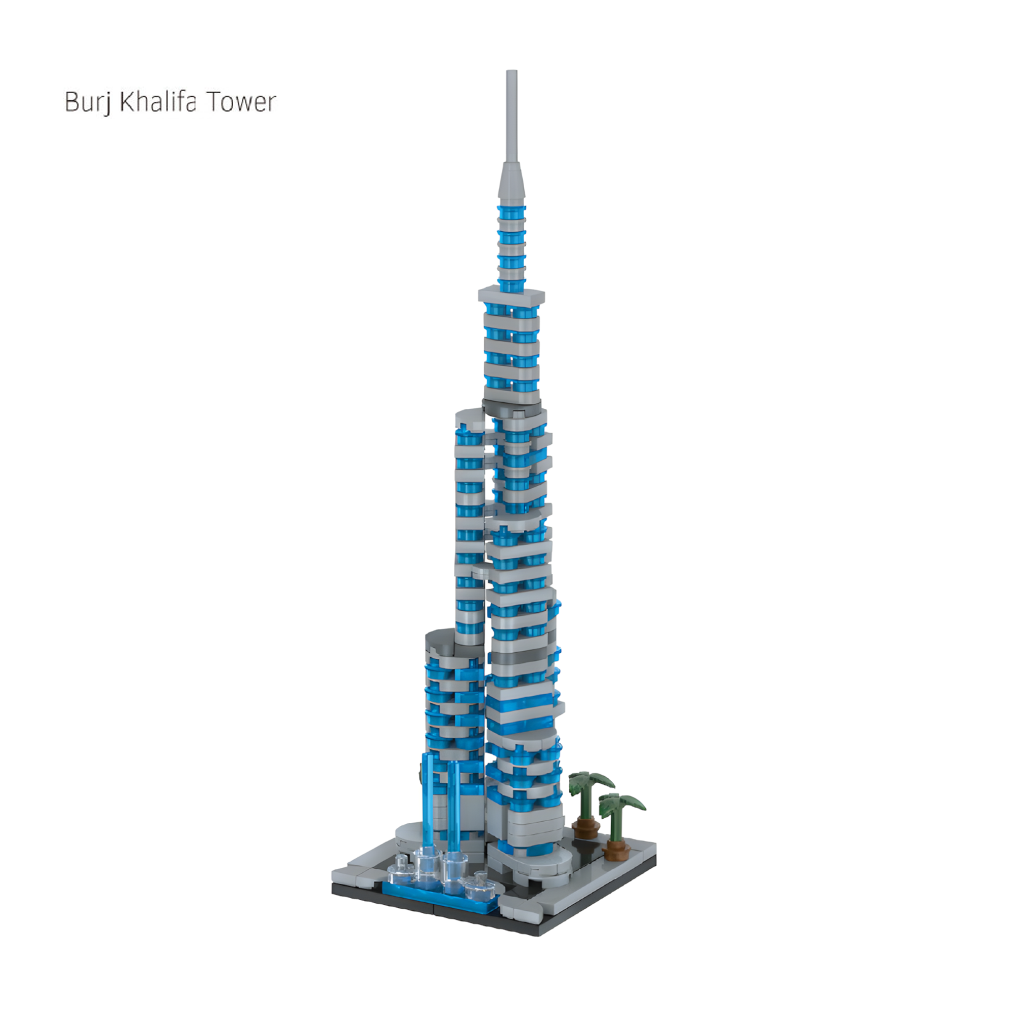 The world’s tallest building reimagined in mini-block form. Its sleek blue-and-gray spirals. towering height. and tiny landscaped base with palm trees reflect the modern marvel’s engineering prowess.