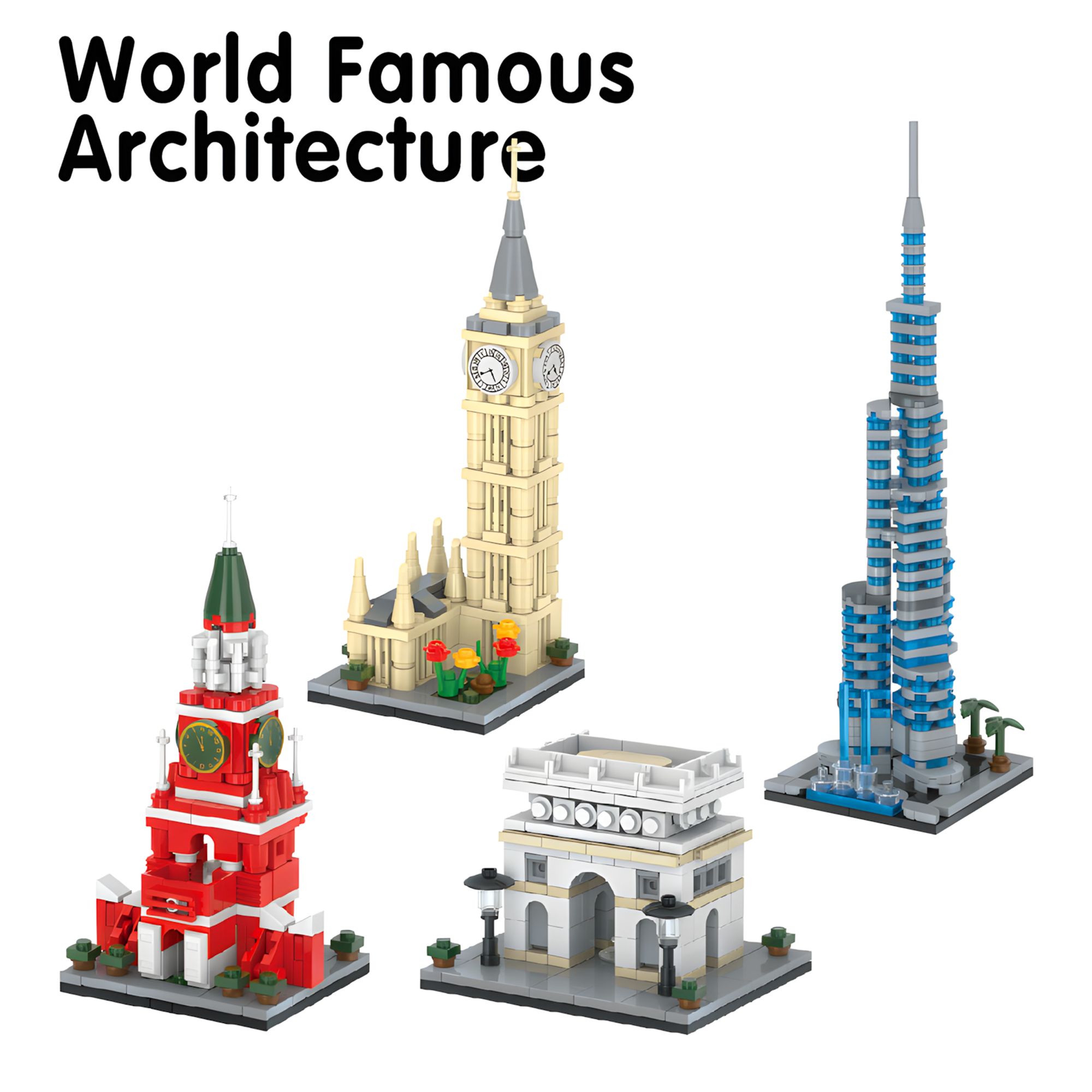 - Includes 4 world-famous landmarks: Elizabeth Tower (Big Ben). Burj Khalifa Tower. Spasskaya Tower. Arc de Triomphe