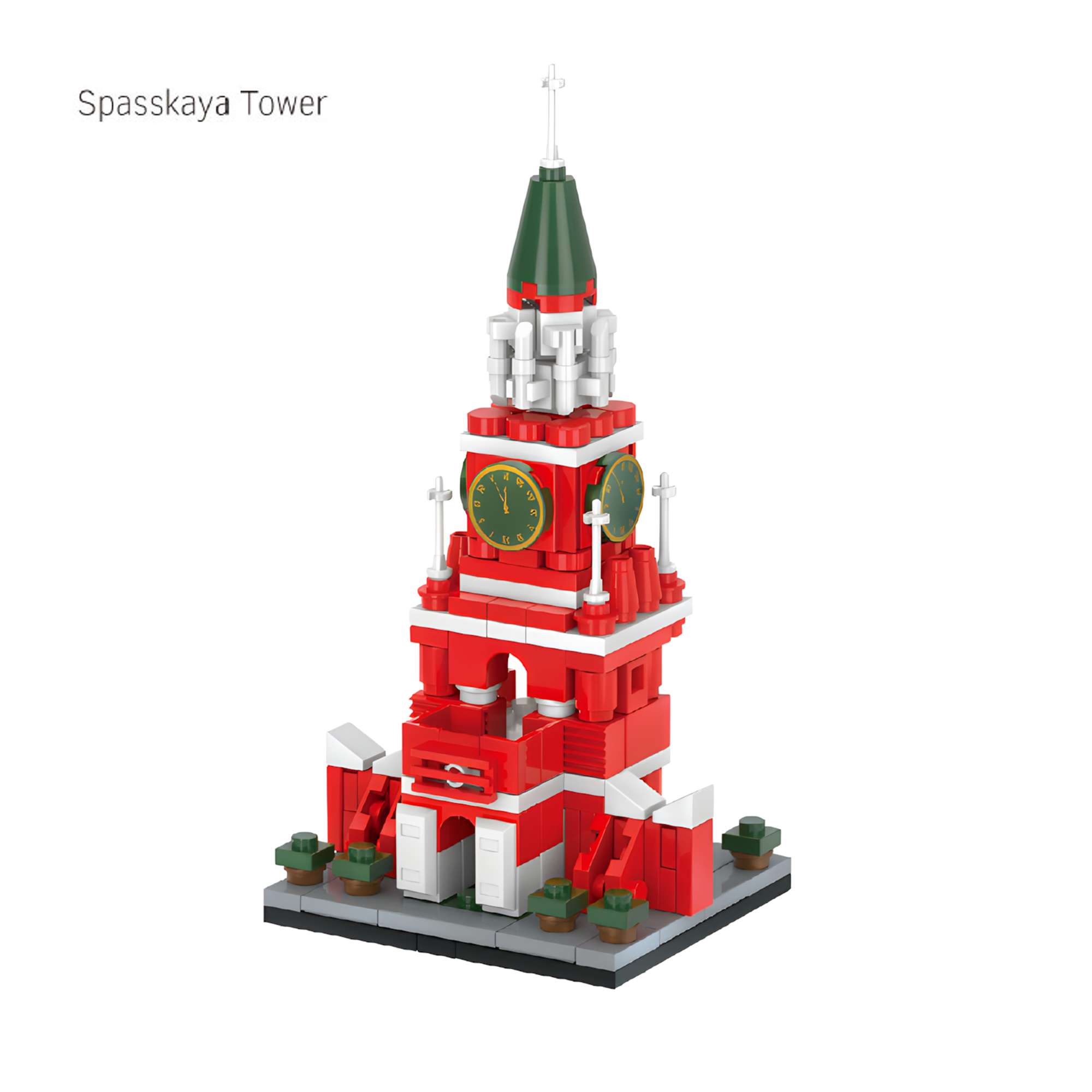 A vibrant miniature of Moscow’s historic red-brick tower. complete with green spires. clock details. and a bold color palette that highlights its cultural significance.