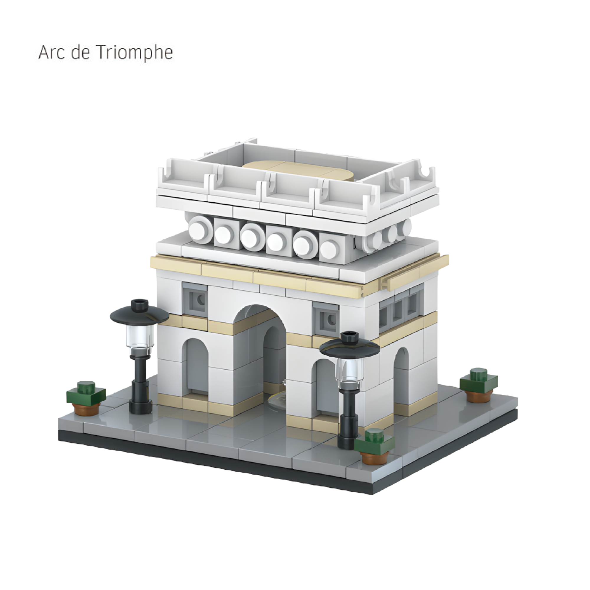 A stylish mini-block rendition of the legendary triumphal arch. featuring arched openings. decorative details. and a small landscaped base with street lamps.