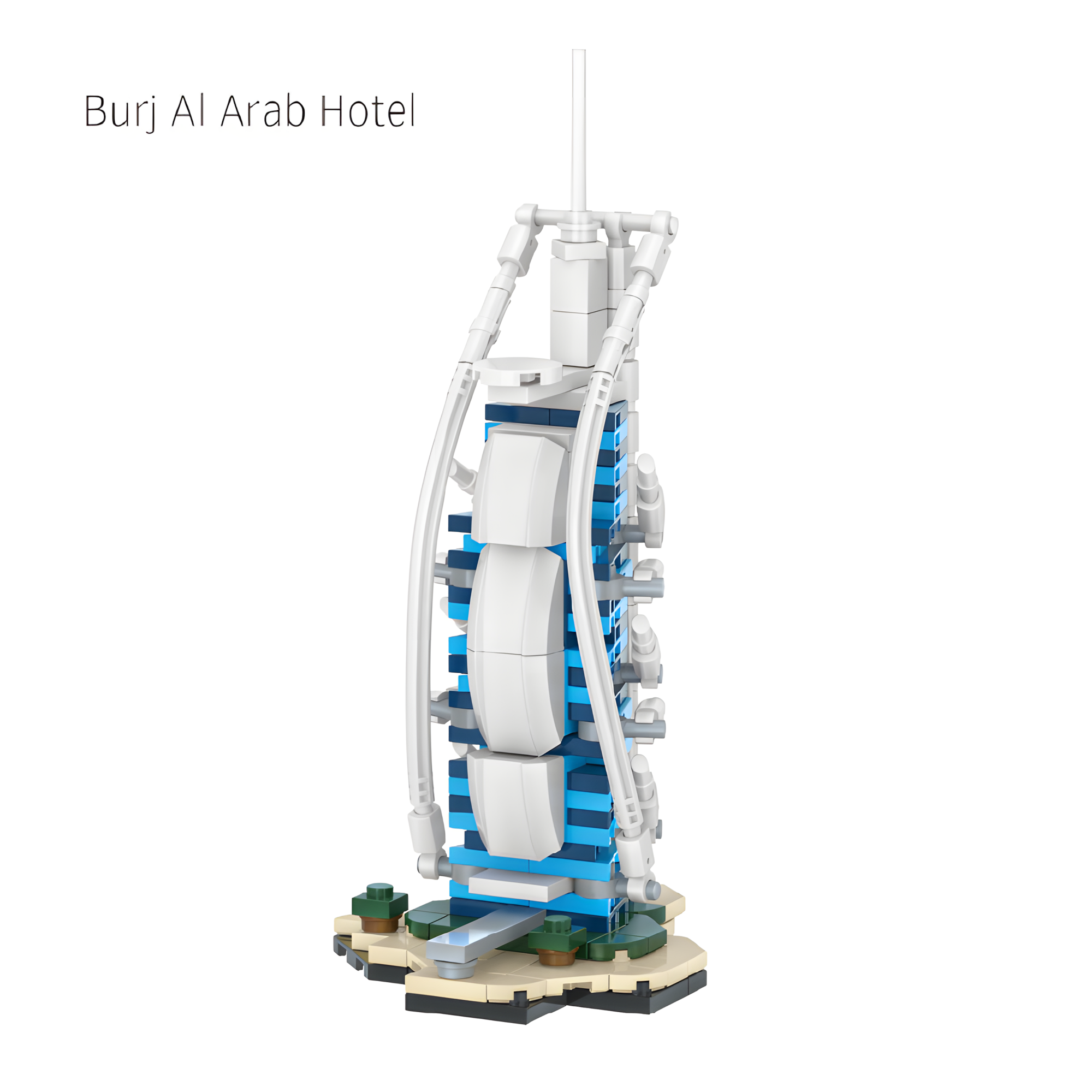 A sleek micro-scale replica of the world-famous sail-shaped hotel. The blue-and-white curvature and unique silhouette capture the luxury landmark’s futuristic identity.