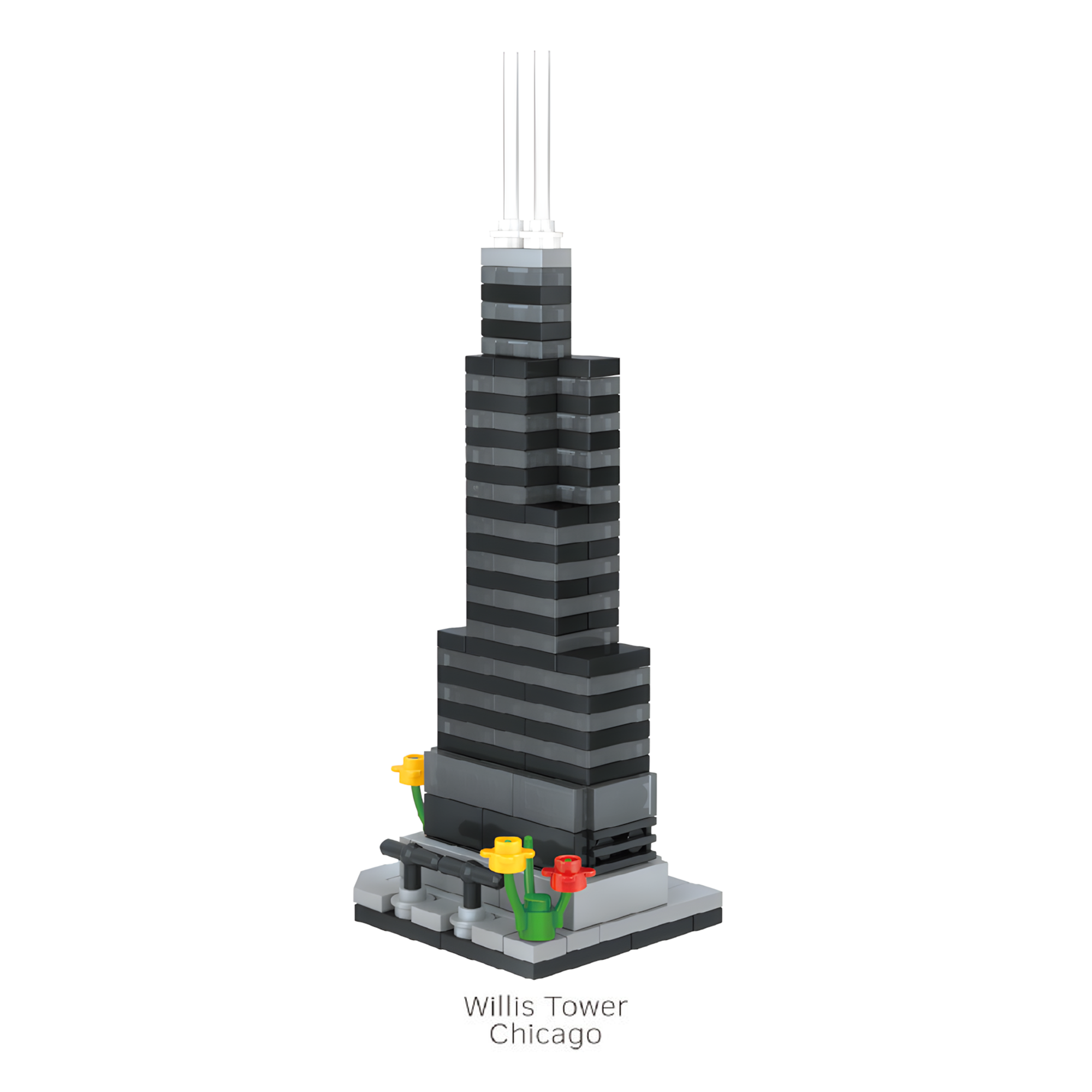 A bold miniature of the legendary skyscraper. complete with layered black blocks. architectural lines. and a small landscaped base with colorful flowers.